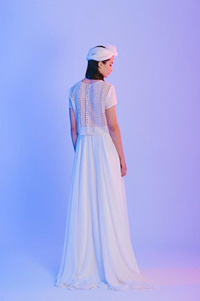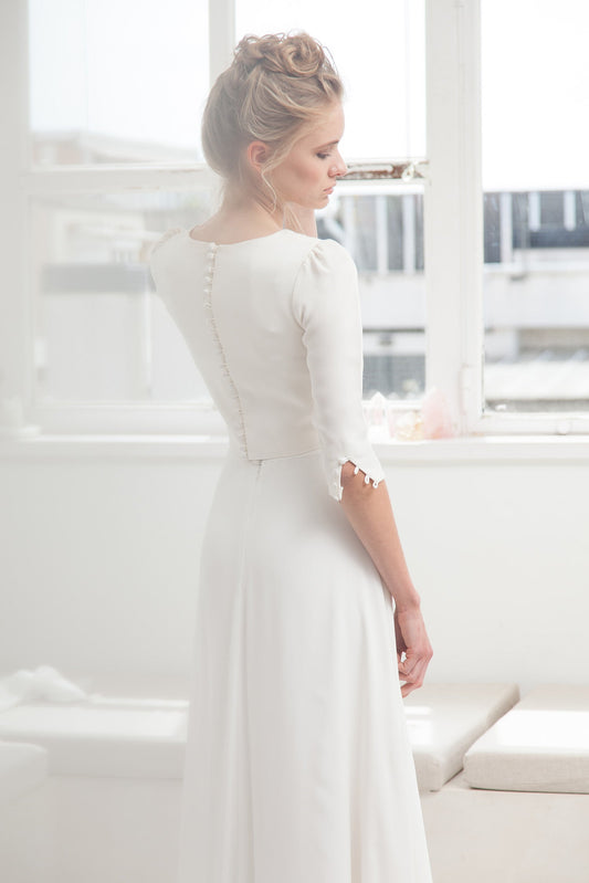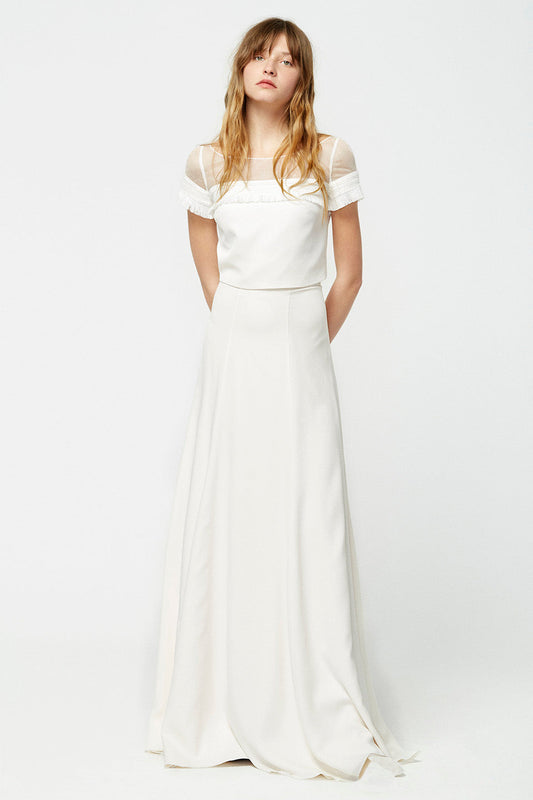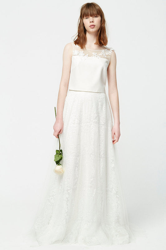 Each top is made from the highest quality materials, including embroidered tulle, crepe and organza, to ensure every bride feels comfortable and confident on her big day. Plus, carefully crafted details like covered buttons and back slits make each top a unique work of art.
